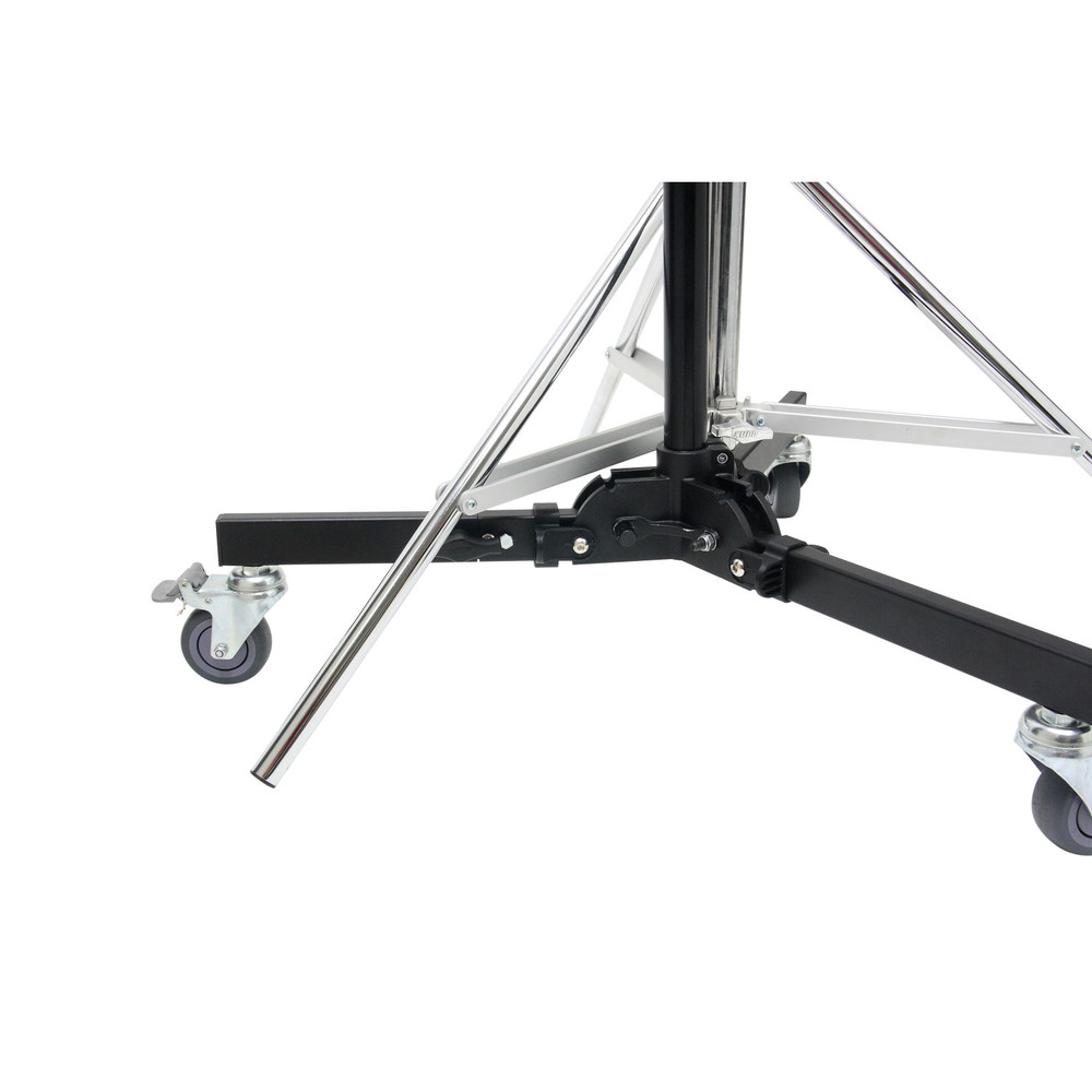 The Kupo Quick-Action Roller Base Stand with wheels is specifically designed for lighting fixtures that need to be placed in low positions. Features a quick-release locking system equipped on each leg for folding and unfolding the stand within seconds. It also comes with a universal stand top that allows it to fit into any fixture. Comes with a junior pin or baby receiver. Meanwhile, your own rolling stand is available by simply adding a century stand column into the junior receiver (28mm socket). One leg is supplied with a leveling device for adjusting the stand on uneven ground. One extendable leg (additional 4.7” (12cm)) is designed for allowing an increase to the loading capability while connecting a boom arm.