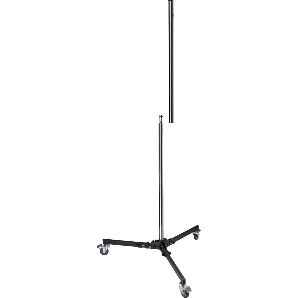Steel column roller stand with a braked wheel allows you to get your lights mobile in the studio or on location with ease and convenience. It features an 8′ chrome plated steel tube and a spring-loaded sliding arm which can be mounted with a lighting fixture, camera, Tethermate or anything with baby pin/receiver. The height of the sliding arm can be quickly adjusted with only one hand from floor level to the top of column. The fold-away base with wheels can be removed easily to facilitate storage or transport.